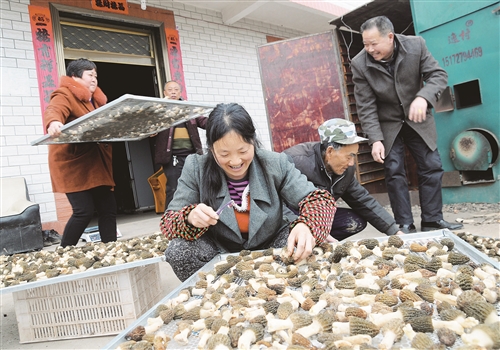 2016年以来,四川省内江市东兴区引进业主在苏家乡等地建立羊肚菌创业园,带动当地村民发展羊肚菌特色产业,促进农民增收致富,预计每亩羊肚菌可创收3万余元。图为3月3日,在四川省内江市东兴区苏家乡朱古寺村8组,当地村民正在采收羊肚菌。李建明 摄