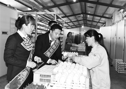 在山东省巨野县,很多农户选择通过养殖来实现脱贫致富。为了进一步扶持当地养殖业发展,山东巨野农商银行不断创新金融服务方式,以“农商银行+合作社+农户”的经营模式,着力提高扶持力度,做好养殖户的后盾。图为该行信贷人员在养殖户刘顺的养殖场内调研。 田忠华 摄
