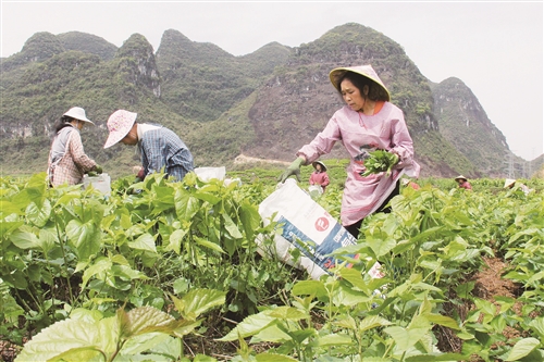 3月26日,广西罗城仫佬族自治县四把镇石门村,“蚕娘”们正在桑园地里采摘鲜嫩春桑叶。近年来,仫佬族自治县抓住东桑西移的机遇,引导山区贫困群众通过成立种桑养蚕专业合作社,实行小蚕共育、大蚕分养、技术指导、统一销售等方式,“抱团”发展桑蚕产业,共同脱贫致富。去年,该县发展桑园总面积达6.14万亩,农民种桑养蚕收入3.6亿元。谢顺珩 摄(cnsphoto 供图)