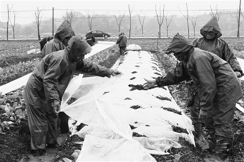 3月22日,江西省横峰县贫困户的留守妇女在有机蔬菜种植基地盖膜保温。该县以贫困户务工工资10%的补贴给种养大户,鼓励他们雇佣贫困户务工的方式,有效解决了扶贫村30户贫困户留守妇女的就业问题。据了解,横峰县属国定贫困县,各扶贫单位创新扶贫帮困方式方法,以“合作社+产业+贫困户”机制,引领贫困户自主创业,扩大帮扶就业人数,探索了一条“摘穷帽”的新路子。康云清 摄(cnsphoto 供图)