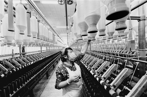 图为3月28日,江西省玉山县德隆纺织女工正在加紧纺织出口欧美的涤纶纱线。
