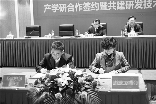 3月28日,山东红日化工股份有限公司与临沂市科学技术合作与应用研究院举行了产学研合作签约暨共建研发中心揭牌仪式。此次与临沂市科研院所签约揭牌,将共同利用国内外科技创新资源,开展深度产学研合作,并联合组织实施相关科技创新计划扶持项目,加快企业技术水平、创新能力及技术咨询服务的提升,将先进的技术成果转化并应用到企业的生产研发当中,实现精细化产品产业化规模的不断扩大。蒋建锋 摄