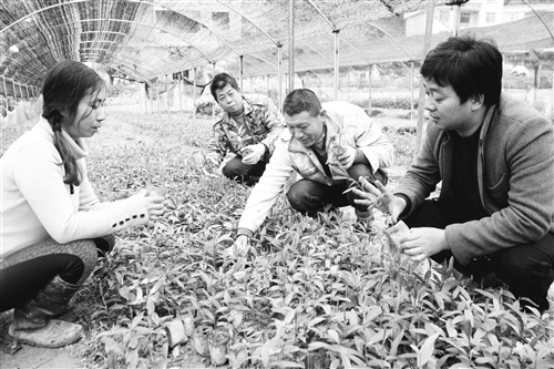 近年来,江西省遂川县大坑乡禾溪村钟传意在部门帮扶下,联合60多家贫困户流转土地200余亩,成立了禾溪湖绿园花卉苗木专业合作社,集中繁育绿化苗木10余种,并在精准扶贫中,培养出了一批农村苗木种植能手,繁育的苗木畅销江浙市场。图为4月12日,钟传意(右一)在给贫困农户传授苗木管理技术。李建平 摄