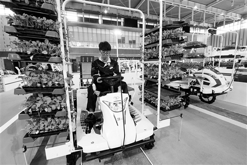 图为4月13日,工作人员在农机展上演示全自动蔬菜移栽机。