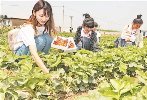 近年来,河北省秦皇岛市海港区海阳镇大力进行产业结构调整,目前已发展千亩果园、千亩蔬菜大棚的现代农业格局。通过发展生态乡村旅游,形成5月采草莓、6月摘樱桃、7月摘蓝莓、8-9月采摘苹果和梨的乡村旅游采摘季,让游客在体验采摘同时,感受到美丽乡村文化的浓郁氛围,使生态采摘游成为农民增收致富的新途径。 曹建雄 摄(cnsphoto 供图)