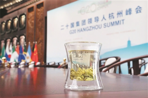 杭州龙冠实业有限公司总经理姜爱芹介绍,“习总书记提的‘四个自信’之一的‘文化自信’,需要一种媒介向外展示,茶叶就是一种媒介、一种文化符号,是用一片树叶讲好中国故事。”他说,这次论坛指定使用的龙井茶,产自位于五云山脚下的西湖龙井茶一级保护区。记者发现,西湖龙井近年来频频亮相重要国事活动,与它的超高知名度不无关系。