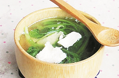 鸡胸肉150克,龙井茶叶15克,鸡毛菜20克,鸡蛋清适量,淀粉适量,鸡汤适量,姜片适量,盐5克,鸡精适量,胡椒粉2克,料酒5克。