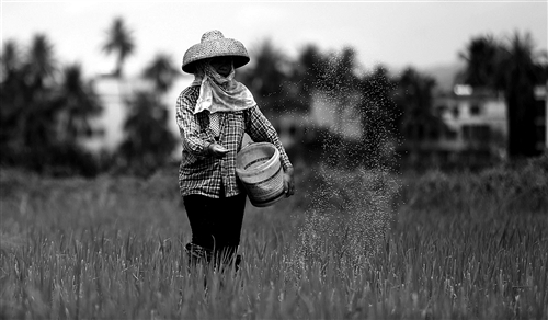 5月21日是二十四节气中的“小满”,各地农民抓住时令开展农业生产,田间地头到处是一派繁忙景象。图为5月21日,海南省三亚市天涯区槟榔河片区一农民在水稻田间施肥。 陈文武 摄(cnsphoto 供图)