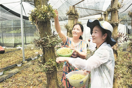 6月8日,位于浙江省磐安县冷水镇岩潭村的铁皮石斛基地正在组织劳力采摘石斛花。磐安县月塘铁皮石斛专业合作社和县方正珍稀药材有限公司总投资2000多万元,在大棚和山上仿野生树栽,种植了200多亩铁皮石斛。眼下正值铁皮石斛开花旺季,当地每斤铁皮石斛干花价格达2000-3000元,经济效益十分看好。
