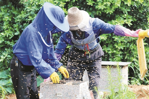 6月6日,江西省遂川县大坑乡灵潭村蜜蜂养殖户张家禹一家在取蜂蜜。近年来,大坑乡利用森林资源大力发展养蜂产业,推行林蜂放养模式,形成“合作社+基地+养蜂户”的产业经营模式,为农民增收开拓了一条绿色生态“甜蜜事业”致富途径。目前,该乡有养蜂户300多户,年养蜜蜂3000多箱,养蜂户户均收入3万元以上。 李建平 摄