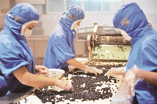2017年,贵州省黔东南州麻江县蓝莓种植面积达到5.6万亩,预计今年总产量可达6000吨。但因为蓝莓鲜果不容易储存和运输,电商销售一直是短板。今年6月,麻江县供销合作社运营的县电商办利用现有资源,通过“公司+网站+基地+公司”的合作形式,在“云淘麻江”、“贵农网麻江特色馆”、“供销e家”、微商等平台立体推广蓝莓鲜果,并与顺丰快递公司合作,确保新鲜度。截至6月14日,麻江县通过电商平台已销售蓝莓鲜果近5000斤,远销上海、浙江、北京、广东、四川等地。图为麻江黔甬蓝莓有限公司分拣车间的工人正在分拣蓝莓鲜果。 王建宏 张旭东 摄