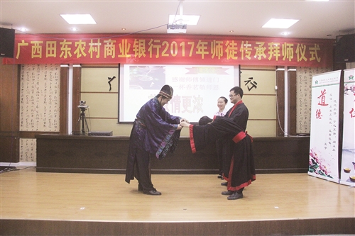 6月8日,广西田东农村商业银行举行2017年“国学之道”讲堂开班仪式,该行按照“以老带新、以熟带生”的原则,挑选出9名业务骨干和中层管理人员作为师傅,19名新招聘的员工作为徒弟,结成师徒对子,由师傅对徒弟加以培养,使其尽快成长、成才。