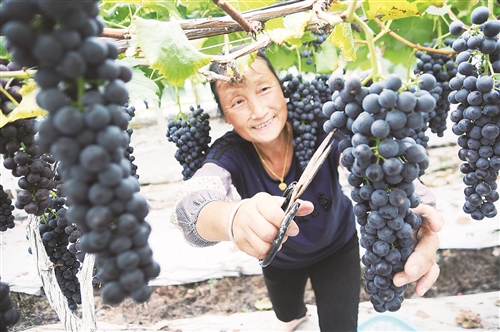 四川内江市东兴区富溪镇染坊坝村采用“专合社+基地+电商”的运作模式,通过有机栽培引种20多个葡萄品种,产品深受消费者的青睐。目前,早熟葡萄品种早夏已成熟上市,每公斤卖到50元,仍然被抢购一空,有效促进了当地农民增收致富。 李建明 摄