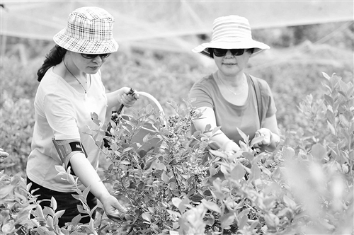6月27日,游客在山东省临沂市郯城县重坊镇的蓝莓庄园采摘蓝莓。盛夏时节,位于重坊镇沂河岸畔的近千亩蓝莓进入采摘期,蓝色的果子簇挂枝头,清香扑鼻,吸引了众多游客前来采摘品尝。据了解, 蓝莓是药食同源的功能性水果,被誉为“浆果之王”。该蓝莓基地采用“网内种植、有机施肥、太阳能杀虫等先进技术,以确保果实绿色环保。 房德华 摄