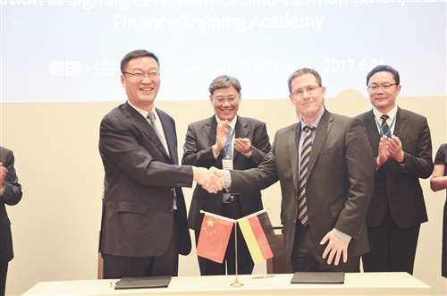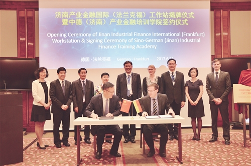 6月21日,济南产业金融国际(法兰克福)工作站揭牌仪式暨中德(济南)产业金融培训学院签约仪式在法兰克福举行。工作站由济南市金融办与德国开元周游集团合作成立,合作双方将致力于把工作站打造成为济南与欧洲产业金融机构及人才的联络平台,持续宣传济南产业形象、解读地方金融生态的推广平台,欧洲产业金融机构及人才招引的信息库管平台,境外并购类项目投融资境内外双核路演平台和济南产业金融国际交流合作暨金融国际论坛联络平台。当天,由德国IPC金融咨询公司与济南农商银行共同出资筹建的中德(济南)产业金融培训学院正式签约,该学院旨在引进德国金融支持实体经济的课程实例,对山东以及华北地区金融系统进行培训。图为济南农商银行董事长马立军(前排左)出席签约仪式。 高 扬 摄