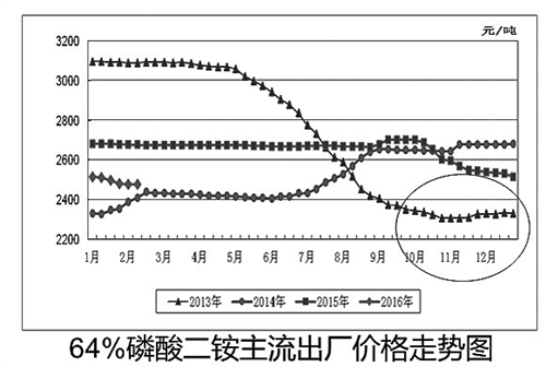 国内磷酸二铵市场在经历了 2013 年的寒冬后,2014 年略有好转,全年平均出厂价低于同期。全年产量、销量同比上升,库存同比下降,企业开工率保持高位,2014年磷酸二铵(各种养分)平均出厂结算价为2527元/吨,同比下降34元/吨;2015年受国内市场总体需求稳定、出口市场良好、原料价格波动不大等因素的影响,市场前三季度保持持续上扬走势,四季度价格明显下跌,2015年磷酸二铵(各种养分)平均出厂结算价为2542元/吨,同比上升15元/吨;2016年磷酸二铵(各种养分)平均出厂结算价为2147元/吨,同比下降395元/吨,可以说2016年磷酸二铵市场一直延续上年底的下行走势,价格跌跌不休,12月中旬以后市场步入缓慢回升轨道,直至2017年上半年市场价格保持稳定态势。