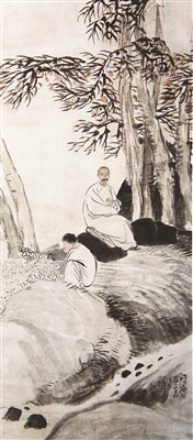 此画里的主人认真地观看童子煮茶,而童子就在两棵大树之间,隐隐还能看到一把蒲扇。此画最有趣的地方是,主人坐的那块石头颇有飘逸之感,仿佛要飘起来的样子。他是怎么坐上去的呢?与之相反的是,眼前的老树却有新芽,如同一种悖论。