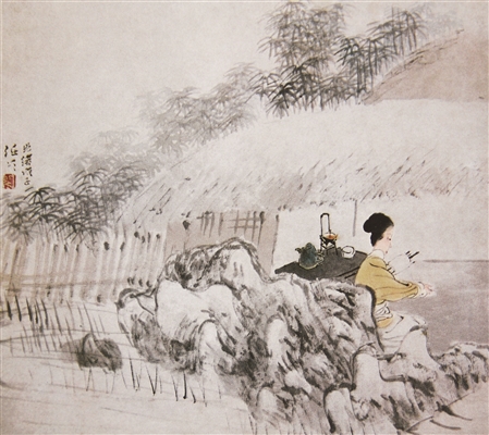另一幅《灯下机织》中,一女子坐于茅屋之外,忙于机织,这也是旧时人家最为普通的生活场景之一。早在汉代就有的“一夫不耕或受之,一妇不织如何或受之寒”的民谣,说的就是一个女人持家机织的重要性。所以说,茅屋里的茶与油灯,反衬出的恰恰是苍生之艰,那一盏油灯、那一杯等渴了才去喝的茶,如同会说话的嘴唇,诉说着机织妇女艰辛的生活。