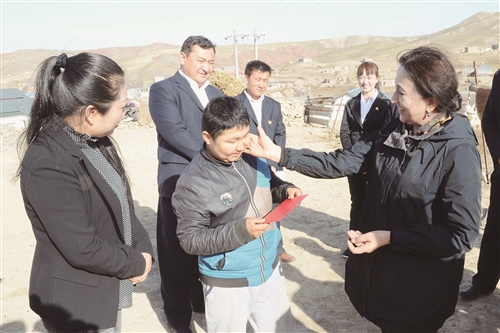 图1为新疆自治区农信联社理事长米力古丽·阿吉努尔在尼勒克县阿依纳巴斯陶村贫困户家中进行走访慰问,并为孩子送上了慰问金。