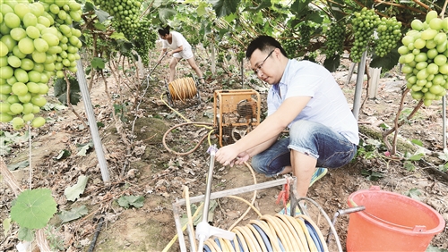辽宁省北镇市闾阳镇闾二村80后青年李大勇自费赴日学习农业环境工程,毕业回国后返乡务农。他利用流转土地自主研发国产连体大棚温室,引进红芭垃蒂、醉金香等30多个新品种葡萄,办起生态葡萄栽种专业生产合作社,拉动当地果蔬生产的同时带富全村人。图为李大勇在为葡萄液体施肥。