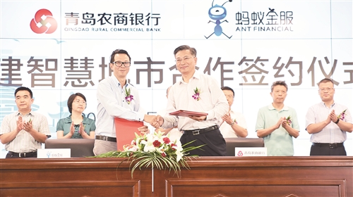 继北京农商银行、广东省农村信用社联合社相继携手京东金融之后,又一家农商银行与互联网巨头达成合作。7月27日,青岛农商银行与蚂蚁金服集团签订共建智慧城市合作协议,青岛农商银行成为蚂蚁金服“智慧城市”项目的首个银行合作伙伴。