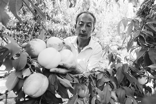 8月24日,山东省平邑县地方镇果树站站长廉士东查看新培育的金香妃黄巨油新品种油桃。该品种果肉金黄细腻,脆甜爽口,浓香四益,8月中旬成熟,单果平均230克以上,最大450克左右,具有自花结实、丰产稳产等特点,发展前景良好。武纪全 摄