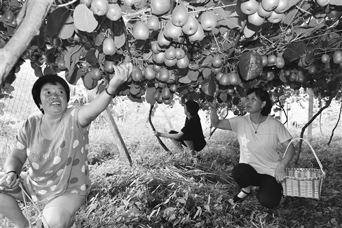 8月31日,游客在浙江省磐安县维新乡马家坑村灵圣家庭农场采摘高山红心猕猴桃。据了解,该农场位于海拔800多米三亩田自然村,3年前种植20多亩高山红心猕猴桃,由于海拔高,生态环境较好,使用有机肥,今年高山红心猕猴桃的产量高、质量优。据悉,已经有不少客户通过微信预订300多箱。 孔德宾 摄