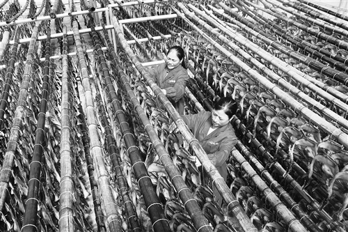 8月29日,江西省遂川县珠田八仔板鸭厂师傅在挂晒一只只准备销往国内外市场的香飘飘板鸭。遂川县素有“中国板鸭之乡”之称,板鸭加工企业采用独特的传统工艺,结合现代科学方法加工的板鸭醇香诱人,产品远销沿海、港澳台及东南亚市场。目前,全县年加工板鸭800万只,总产值达3亿多元,辐射带动1万多农户增收致富。 李建平 摄