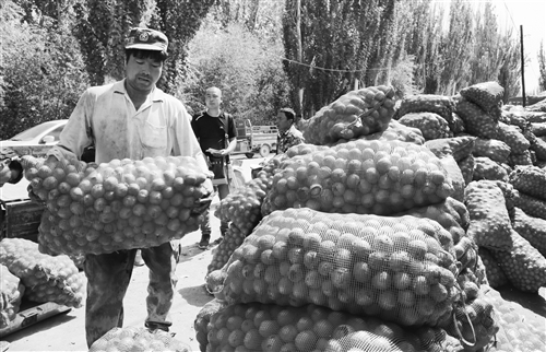 近年来,新疆维吾尔自治区温宿县把不断调优做强核桃产业作为实现农民増收措施来抓,积极鼓励农民种植早中晩熟核桃品种,做到每个时间节点都有产品上市,极大地调动了广大农民种植和生产的积极性。截至目前,该县优质核桃面积发展到70万亩,其中核桃挂果达52万亩,今年预计核桃总产量可达10万吨。图为9月4日温宿县托乎拉乡海力瓦甫村农民在销售丰收的青皮核桃。颜寿林 摄
