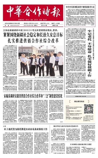 王侠在新疆调研中发〔2015〕11号文件贯彻落实情况,要求:紧紧围绕新疆社会稳定和长治久安总目标 扎实推进供销合作社综合改革