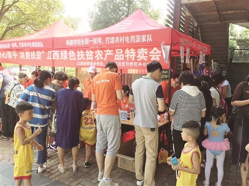 江西省南昌市万科四季花城小区内两栋红色简易棚前人群熙熙攘攘,好不热闹。红色横幅上“‘构建全国供销一张网 打造农村电商国家队’江西绿色扶贫农产品特卖会”标语赫然可见。一排摊铺前,大人孩子、老年人……悠闲的社区居民正忙不迭地品尝试吃、扫码付款、询问交谈、转盘抽奖、领取爱心扶贫卡。
