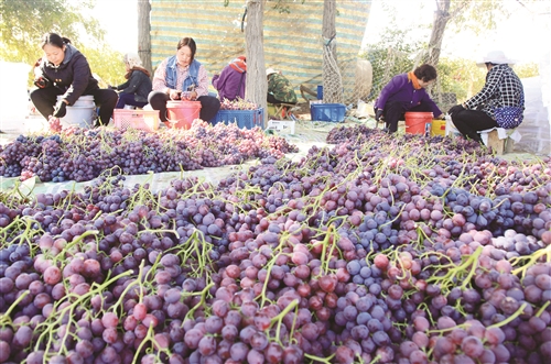 9月20日,新疆生产建设兵团第五师八十九团园艺一场的果农在对刚采收的红提葡萄进行取杂,确保果品优质率。作为五师北疆红提种植面积最大的团场,他们在实行统一管理、统一质量、统一品牌、统一包装、统一销售的同时,从开始种植至今一直狠抓质量品牌不松手,叫响了红提品牌,使红提产业成为致富产业。任登举 摄