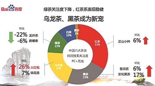 百度大数据显示,与茶相关的搜索请求每天多达15万次,与2014年同期相比增长了两倍,通过互联网搜索茶的人越来越多。