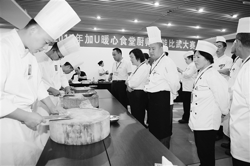 本报讯 9月23日,中农集团下属中农餐茂(北京)餐饮有限公司组织举办了“2017年加U暖心食堂厨师技能比武大赛”,以进一步提升职工食堂的饭菜品级、食材安全、服务质量等服务水平。本次共有28名厨师、5名服务员分别参加了面点、冷盘、精品菜肴、刀工、摆台等多项比赛。中农餐茂特邀上海锦心国际餐饮有限公司行政大厨共同组成评审组,对参赛厨师们的技艺、服务员摆台水平进行打分评审。
