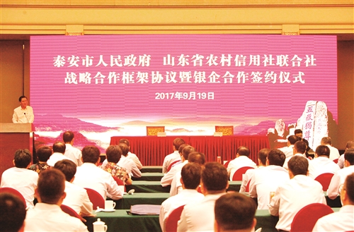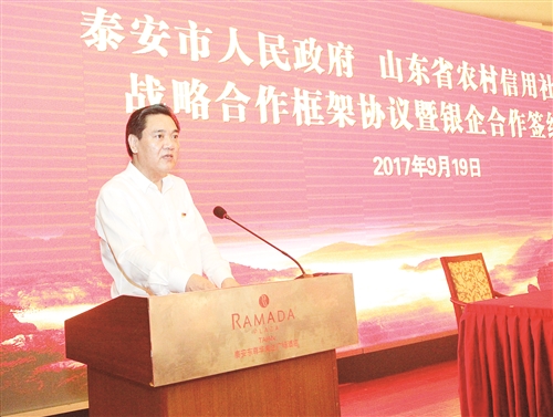泰安市政府将紧紧围绕增创工业经济发展、旅游经济发展、城市经济发展、农业融合发展、社会和谐发展“五大”发展新优势,进一步加大对全市农商银行的政策支持力度,推进农商银行深化改革,加强金融生态环境建设。泰安市政府将以最大的诚意、最优的环境和最高效的服务,为落实协议创造更有利的条件、提供更有效的保障,努力实现双方优势互补、互惠共赢,谱写共谋发展、共创未来的新篇章。