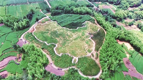日前,笔者来到位于点头镇大坪村的六妙白茶庄园内的一处小山丘上,从高处俯瞰,创意图案映入眼帘,勾勒出的“中国地图”图案几乎占据整座山头大部分,轮廓清晰,美轮美奂,呈现出另类茶园之美。