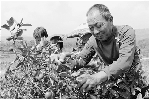 10月7日,湖南省邵阳县下花桥镇新亭村农民在新造油茶林地摘茶籽。被冠名为“中国茶油之都”的邵阳县,拥有科学低改油茶林10万余亩,建成高标准油茶基地130多个,优质高产。目前全县油茶面积达40万亩,年茶油总产达600万公斤,农民茶油增收近2亿元。油茶林已成为农民致富的“摇钱树”和“绿色银行”。 李爱民 摄