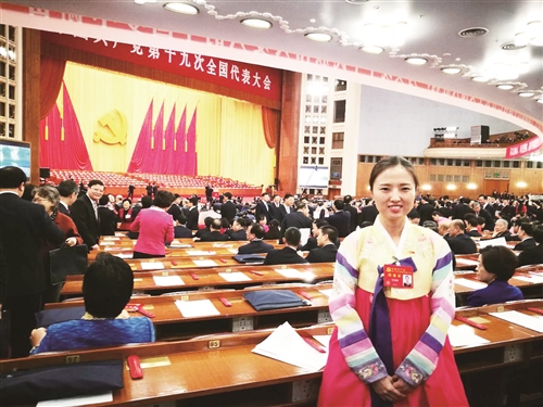 10月18日,十九大代表、天津滨海农商银行营城支行综合柜员金慧琼在首都北京人民大会堂,出席党的十九大开幕会。青春活力的面庞配上一身亮色朝鲜族服饰,让这个90后基层党代表更显落落大方,她难掩内心激动地告诉记者:“作为一名基层党代表,我感到无上光荣,尤其是习近平同志整整三个半小时站在那里作报告,特别感染人,我很受鼓舞。”