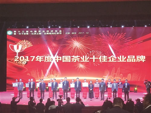 随后,中国茶叶流通协会公布2017年中国茶叶行业调查结果,对茶业扶贫示范县、生态茶乡、最美茶乡、领军企业、十佳品牌、终身成就奖进行授牌,同时公布了全国百强企业、重点产茶县和中国制茶大师候选人(第一批)名单。此外,此次开幕式上还揭晓了下届年会的承办地。经过前期激烈的角逐,举办资格最终由福建省南平市获得。在开幕式最后举行的会旗交接仪式上,临沧市人民政府将代表友谊、信念、梦想的年会会旗传递至南平市。