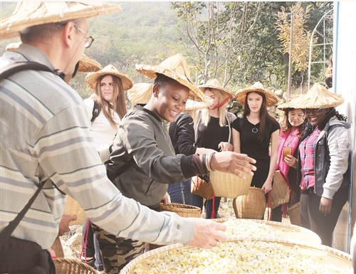 10月21日,河北省邢台学院来自俄罗斯、津巴布韦、韩国等国的留学生一行17人,来到邢台太行山区临城东篱茶园进行中国文化课程教学实践。在东篱茶园高级茶艺师杨素珍的带领下,留学生们亲身参与了采茶、制茶、泡茶、品茶的各个环节。大家头戴斗笠,身背箩筐,亲身感受采茶的乐趣,观摩制茶的过程,请教泡茶的学问,体味品茶的文化。外国留学生们第一次走进中国茶园,零距离接触茶叶。