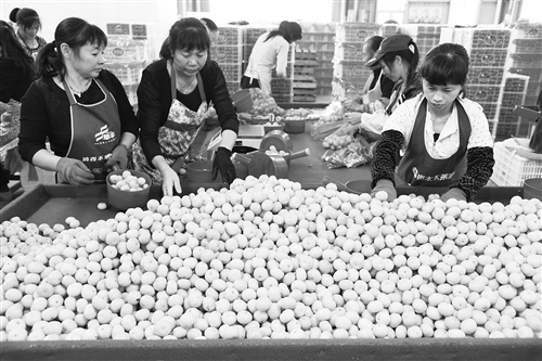 图为11月7日,中国桔都(江西南丰)国际果贸城蜜桔合作联社内,桔农们在加工包装南丰蜜桔,准备销往泰国、印度尼西亚等东南亚国家和地区。