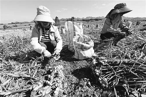 云南省罗平县水土丰沃,气候温和,非常适宜小黄姜种植。近年来,罗平县把小黄姜作为农业增效、农民增收的优势主导产业来发展,不断推进小黄姜的特色化、规模化和产业化种植。2017年,该县种植小黄姜17万亩,时下正值收获季节,亩产量达1.8吨,预计产量30万吨,总产量全国第一,产值近8亿元,有效鼓起当地农民的钱袋子。图为11月15日,农民在地里收获小黄姜。毛虹 摄 (cnsphoto 供图)