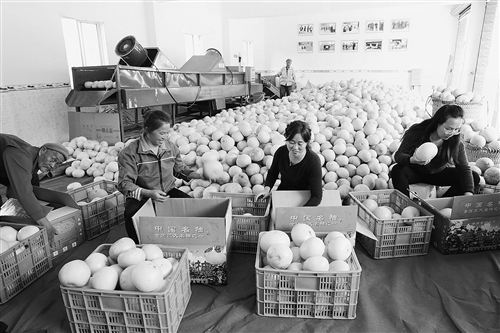 从今年霜降起,重庆市梁平区大观柚子专业合作社生产的柚子供不应求,每天有7吨—10吨的柚子销往湖北、贵州、四川、重庆等地。合作社今年种植了400余亩梁平柚,预计产量将达到1000吨,可为社员带来300万元的收益。图为社员们正在对清洗后的梁平柚子进行筛选,然后将柚子装箱准备销往湖北荆州等地。