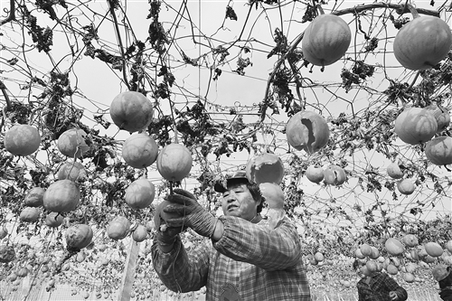 近日,在江苏省宿迁市宿城区中扬镇瓜蒌种植基地里,金黄色的瓜蒌挂满枝头。瓜蒌具有很高的药用价值,它的果实、果皮、果仁(籽)、根茎均为上好的中药材。宿城区计划明年将扩大种植规模,建成苏北地区最大的瓜蒌种植基地。图为宿城区中扬镇瓜蒌种植合作社社员正在采收金黄色的瓜蒌。