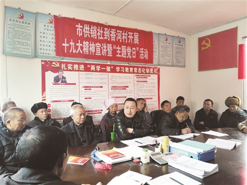 11月21日,为促进党的十九大精神迅速传达到农村,助推农村脱贫攻坚战,贵州省凯里市供销合作社党组书记白渝丰带领全体党员,深入结对帮扶的香河村开展党的十九大会议精神宣讲暨“主题党日”活动。宣讲会阐述了十九大的亮点、三大重大成果、十大关键词及伟大的历史意义,并解读了农民最关心的土地承包问题。大家还针对香河村的基础设施建设、产业发展、脱贫攻坚等问题,展开讨论、提出意见。
