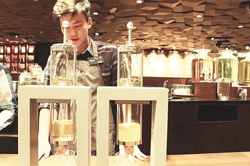虽然之前传出星巴克的茶饮生意在北美市场上不尽如人意,但是在上海的烘焙工坊里,星巴克依旧开辟出一块茶饮吧台。为喜欢尝试新鲜事物和体验的顾客带来耳目一新的时尚茶饮体验。浅青玉色的茶瓦纳吧台,灵感来源于中国传统陶瓷茶具的风格。使用了3D打印技术和可循环材料,全长7.5米(25英尺)。一共有20款茶饮料首次登陆中国,对于喜爱创新冲煮方式的顾客来说,融合科技感和戏剧观赏性的蒸汽朋克冲煮系统绝不容错过,在欣赏茶叶在水中起舞的同时,独特风味也被蒸汽完整萃取,适合各种纯茶和拼配茶。
