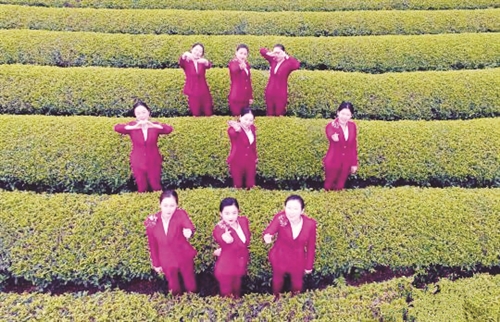 12月13日,在素有“瓷之源,茶之乡”美誉的江西景德镇市浮梁县,漫山遍野的茶树涌碧荡翠,翻青卷绿的画面吸引着游客纷至沓来。当天,来自南昌客运段的“高姐们”走进九景衢铁路沿线,来到景德镇市浮梁县新佳茶场,展示美好新形象,推介铁路客运新产品。