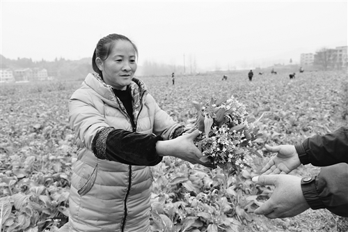 12月23日,湖南省隆回县桃洪镇龙富村蔬菜专业种植合作社社员在采摘白菜苔。2017年,该村"两委"结合产业扶贫政策,成立蔬菜专业种植合作社,带领7户贫困户种植白菜苔和红菜苔共160亩,菜苔直销广东,成功创出一条产业脱贫新路。
