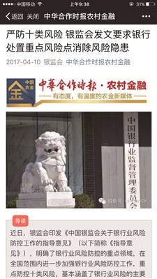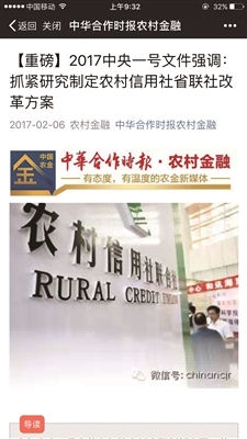 2月5日,2017中央一号文件发布,在加快农村金融创新方面,共提出了28条举措。其中强调:抓紧研究制定农村信用社省联社改革方案;支持农村商业银行、农村合作银行、村镇银行等农村中小金融机构立足县域,加大服务“三农”力度;落实涉农贷款增量奖励政策;对达标县域机构执行优惠的存款准备金率;加快农村金融立法等。