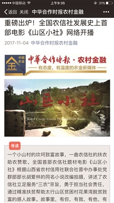 10月29日,全国农信社发展史上首部电影《山区小社》网络开播。电影根据山西省农村信用社联合社晋中办事处党群部部长胡爱林的同名小说改编拍摄,讲述了农信社立足服务“三农”宗旨,勇于担当社会责任,通过精准扶贫帮助太行山区贫困村村民脱贫致富的感人故事。